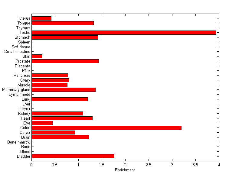 The expression level is normalized with tissue-library size. Each value for a gene in a tissue is a ratio of observed ESTs to the expected one in this tissue. The expected number of ESTs is the product of total ESTs of the gene and the fraction of total ESTs in the tissue among all ESTs in 30 tissues.
