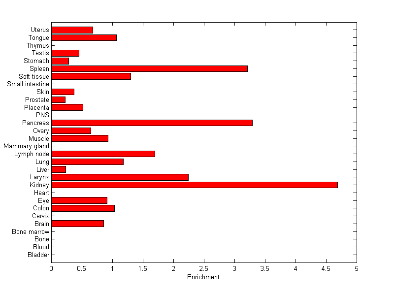The expression level is normalized with tissue-library size. Each value for a gene in a tissue is a ratio of observed ESTs to the expected one in this tissue. The expected number of ESTs is the product of total ESTs of the gene and the fraction of total ESTs in the tissue among all ESTs in 30 tissues.