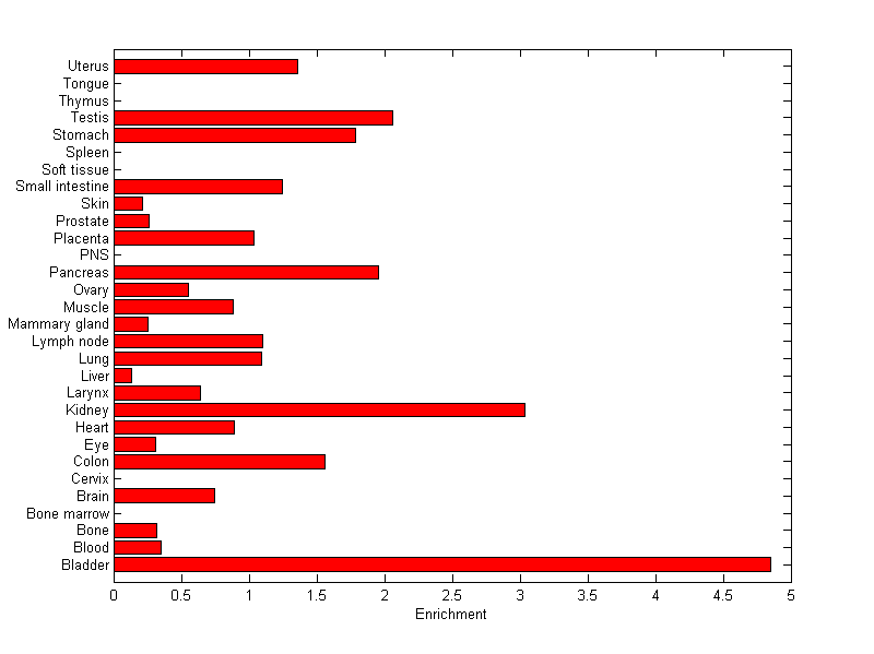 The expression level is normalized with tissue-library size. Each value for a gene in a tissue is a ratio of observed ESTs to the expected one in this tissue. The expected number of ESTs is the product of total ESTs of the gene and the fraction of total ESTs in the tissue among all ESTs in 30 tissues.