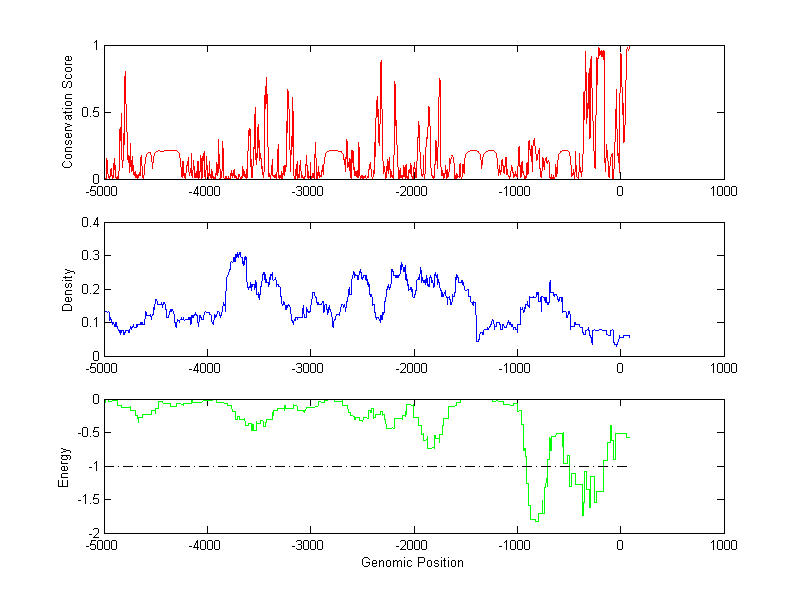 The energy profile (green curve) is about energy for module detection based on TF interaction. The positions with energy less than -1 indicate the existence of CRMs.