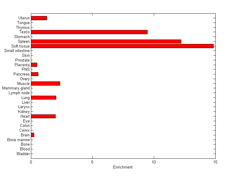 The expression level is normalized with tissue-library size. Each value for a gene in a tissue is a ratio of observed ESTs to the expected one in this tissue. The expected number of ESTs is the product of total ESTs of the gene and the fraction of total ESTs in the tissue among all ESTs in 30 tissues.