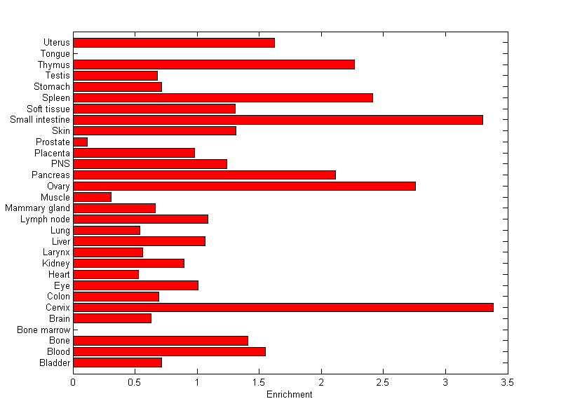 The expression level is normalized with tissue-library size. Each value for a gene in a tissue is a ratio of observed ESTs to the expected one in this tissue. The expected number of ESTs is the product of total ESTs of the gene and the fraction of total ESTs in the tissue among all ESTs in 30 tissues.