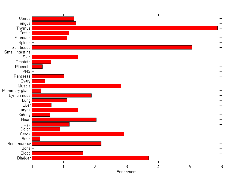 The expression level is normalized with tissue-library size. Each value for a gene in a tissue is a ratio of observed ESTs to the expected one in this tissue. The expected number of ESTs is the product of total ESTs of the gene and the fraction of total ESTs in the tissue among all ESTs in 30 tissues.