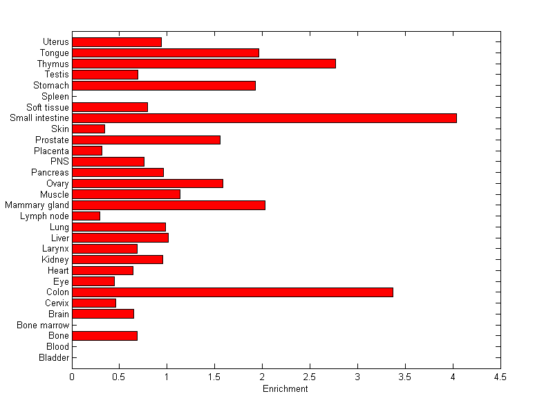 The expression level is normalized with tissue-library size. Each value for a gene in a tissue is a ratio of observed ESTs to the expected one in this tissue. The expected number of ESTs is the product of total ESTs of the gene and the fraction of total ESTs in the tissue among all ESTs in 30 tissues.