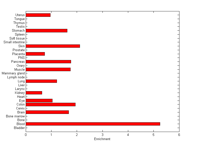 About the profile: The expression level is normalized with tissue-library size. Each value for a gene in a tissue is a ratio of observed ESTs to the expected one in this tissue. The expected number of ESTs is the product of total ESTs of the gene and the fraction of total ESTs in the tissue among all ESTs in 30 tissues. Download: |
