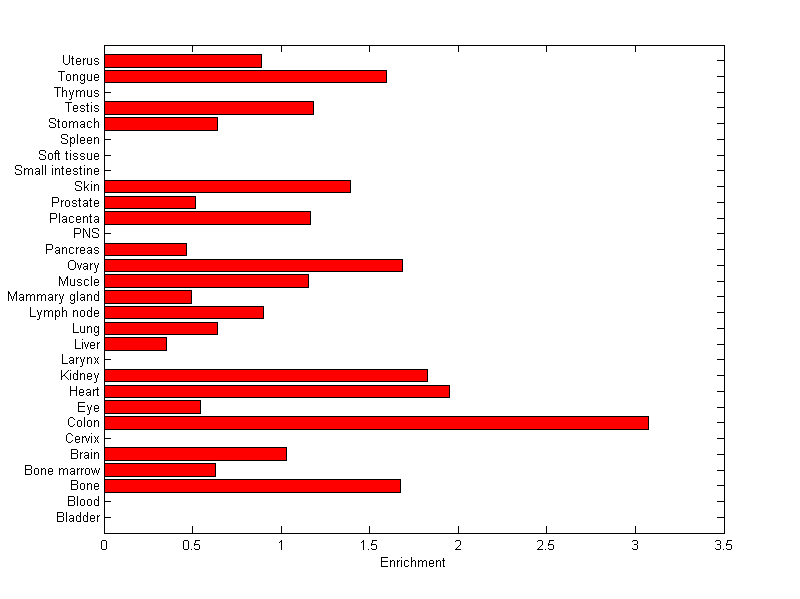 The expression level is normalized with tissue-library size. Each value for a gene in a tissue is a ratio of observed ESTs to the expected one in this tissue. The expected number of ESTs is the product of total ESTs of the gene and the fraction of total ESTs in the tissue among all ESTs in 30 tissues.