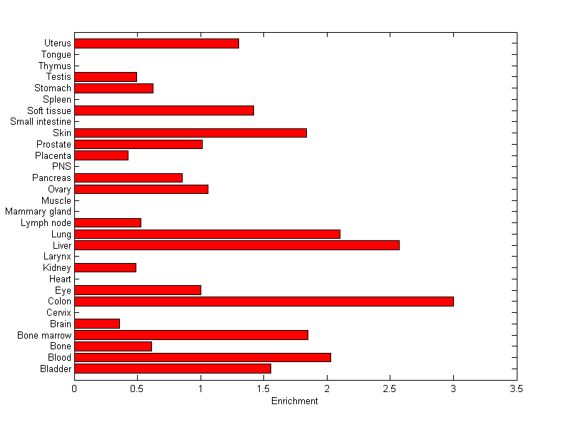 The expression level is normalized with tissue-library size. Each value for a gene in a tissue is a ratio of observed ESTs to the expected one in this tissue. The expected number of ESTs is the product of total ESTs of the gene and the fraction of total ESTs in the tissue among all ESTs in 30 tissues.