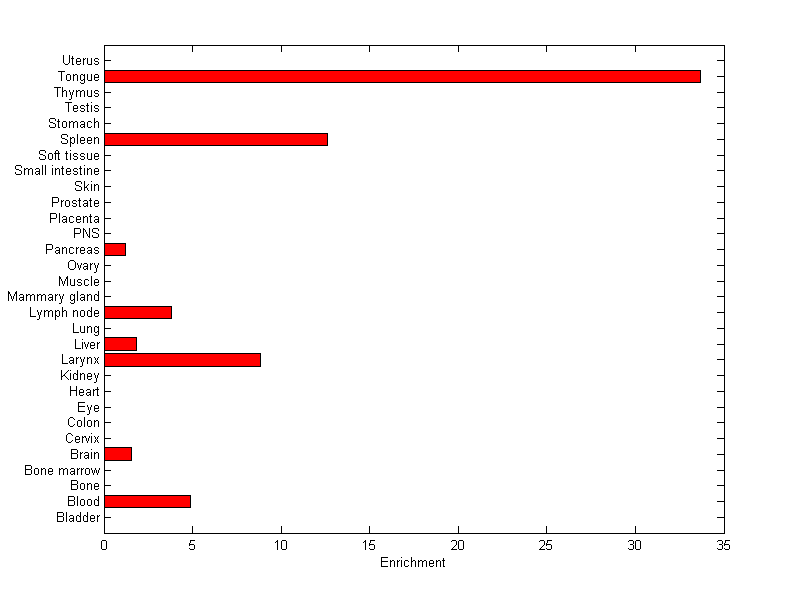 About the profile: The expression level is normalized with tissue-library size. Each value for a gene in a tissue is a ratio of observed ESTs to the expected one in this tissue. The expected number of ESTs is the product of total ESTs of the gene and the fraction of total ESTs in the tissue among all ESTs in 30 tissues. Summary: This gene is preferentially expressed in [tongue] Download: |