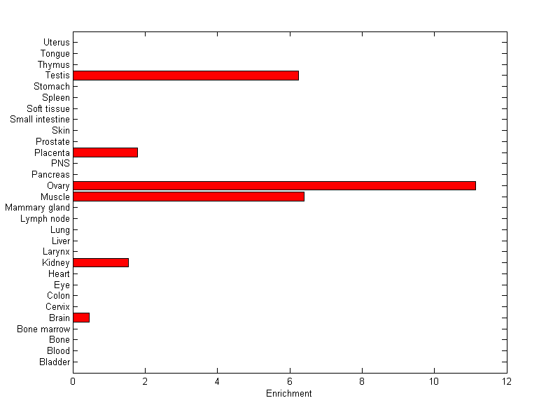 About the profile: The expression level is normalized with tissue-library size. Each value for a gene in a tissue is a ratio of observed ESTs to the expected one in this tissue. The expected number of ESTs is the product of total ESTs of the gene and the fraction of total ESTs in the tissue among all ESTs in 30 tissues. Summary: This gene is preferentially expressed in [ovary] Download: |