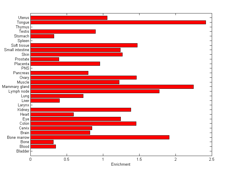 The expression level is normalized with tissue-library size. Each value for a gene in a tissue is a ratio of observed ESTs to the expected one in this tissue. The expected number of ESTs is the product of total ESTs of the gene and the fraction of total ESTs in the tissue among all ESTs in 30 tissues.