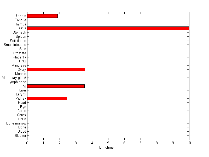 The expression level is normalized with tissue-library size. Each value for a gene in a tissue is a ratio of observed ESTs to the expected one in this tissue. The expected number of ESTs is the product of total ESTs of the gene and the fraction of total ESTs in the tissue among all ESTs in 30 tissues.