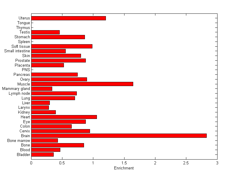 The expression level is normalized with tissue-library size. Each value for a gene in a tissue is a ratio of observed ESTs to the expected one in this tissue. The expected number of ESTs is the product of total ESTs of the gene and the fraction of total ESTs in the tissue among all ESTs in 30 tissues.