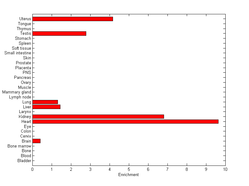 The expression level is normalized with tissue-library size. Each value for a gene in a tissue is a ratio of observed ESTs to the expected one in this tissue. The expected number of ESTs is the product of total ESTs of the gene and the fraction of total ESTs in the tissue among all ESTs in 30 tissues.