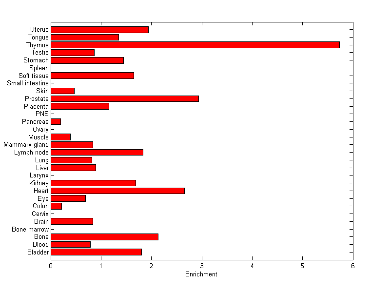 The expression level is normalized with tissue-library size. Each value for a gene in a tissue is a ratio of observed ESTs to the expected one in this tissue. The expected number of ESTs is the product of total ESTs of the gene and the fraction of total ESTs in the tissue among all ESTs in 30 tissues.