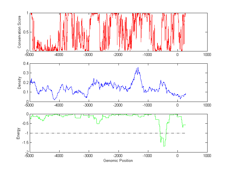 The energy profile (green curve) is about energy for module detection based on TF interaction. The positions with energy less than -1 indicate the existence of CRMs.