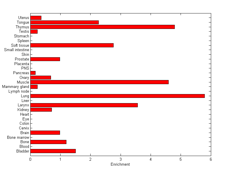 The expression level is normalized with tissue-library size. Each value for a gene in a tissue is a ratio of observed ESTs to the expected one in this tissue. The expected number of ESTs is the product of total ESTs of the gene and the fraction of total ESTs in the tissue among all ESTs in 30 tissues.