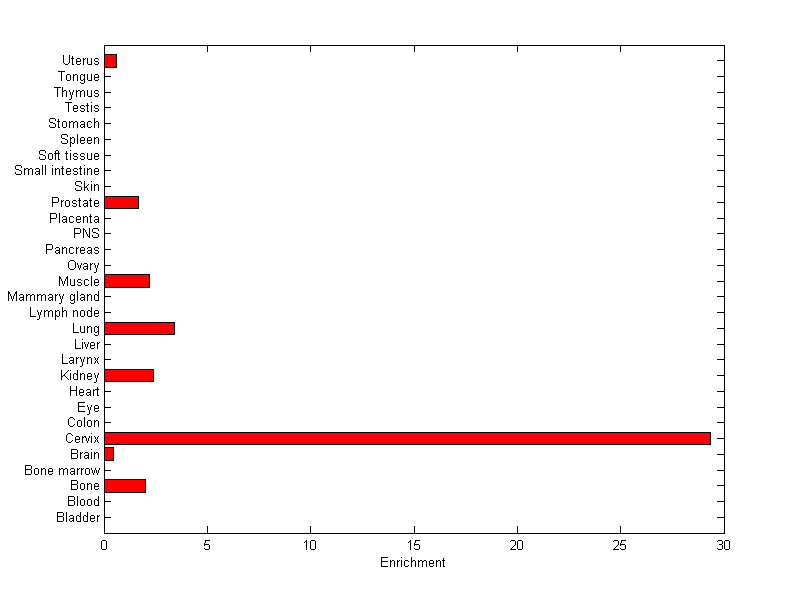 The expression level is normalized with tissue-library size. Each value for a gene in a tissue is a ratio of observed ESTs to the expected one in this tissue. The expected number of ESTs is the product of total ESTs of the gene and the fraction of total ESTs in the tissue among all ESTs in 30 tissues.