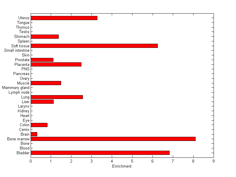 The expression level is normalized with tissue-library size. Each value for a gene in a tissue is a ratio of observed ESTs to the expected one in this tissue. The expected number of ESTs is the product of total ESTs of the gene and the fraction of total ESTs in the tissue among all ESTs in 30 tissues.