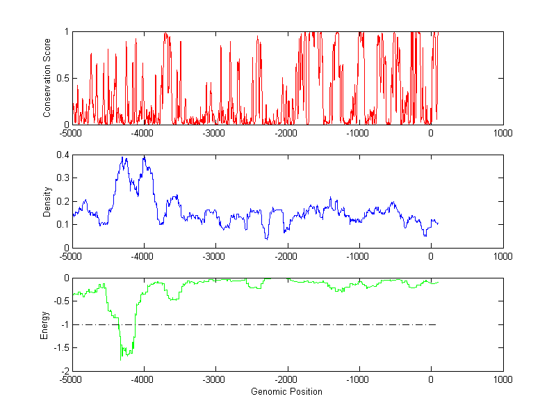 The energy profile (green curve) is about energy for module detection based on TF interaction. The positions with energy less than -1 indicate the existence of CRMs.