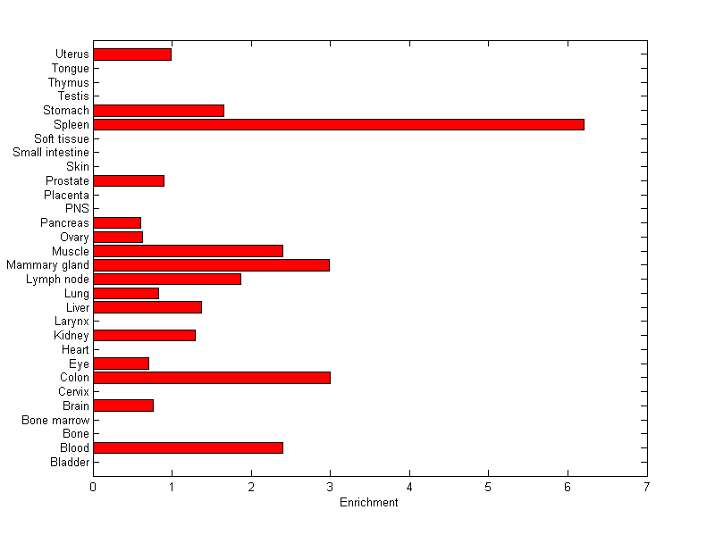 The expression level is normalized with tissue-library size. Each value for a gene in a tissue is a ratio of observed ESTs to the expected one in this tissue. The expected number of ESTs is the product of total ESTs of the gene and the fraction of total ESTs in the tissue among all ESTs in 30 tissues.