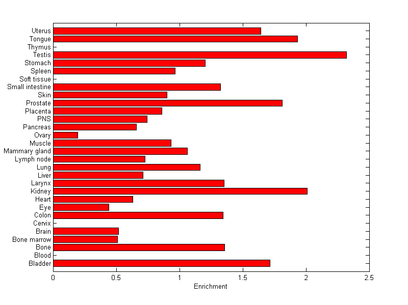 The expression level is normalized with tissue-library size. Each value for a gene in a tissue is a ratio of observed ESTs to the expected one in this tissue. The expected number of ESTs is the product of total ESTs of the gene and the fraction of total ESTs in the tissue among all ESTs in 30 tissues.