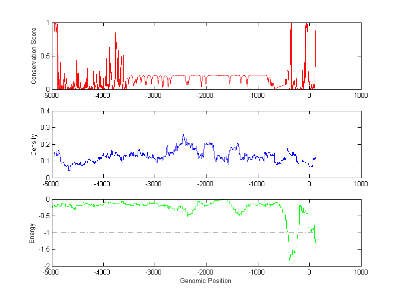 The conservation profile (red curve) is about conservation scores of the promoter sequences. Conservation was determined from an eight-way alignment of human, chimpanzee, dog, mouse, rat, chicken, zebrafish and fugu sequences. The conservation was quantified by a conservation score between 0 and 1, with 1 as highest conservation. The conservation score was obtained from UCSC genome databases.