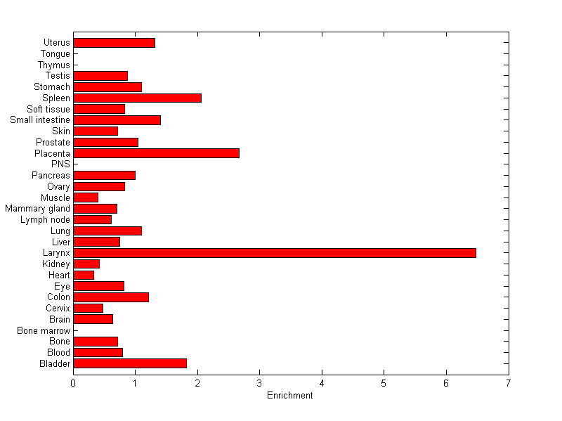 The expression level is normalized with tissue-library size. Each value for a gene in a tissue is a ratio of observed ESTs to the expected one in this tissue. The expected number of ESTs is the product of total ESTs of the gene and the fraction of total ESTs in the tissue among all ESTs in 30 tissues.