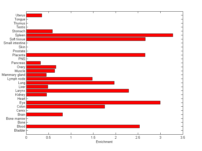 The expression level is normalized with tissue-library size. Each value for a gene in a tissue is a ratio of observed ESTs to the expected one in this tissue. The expected number of ESTs is the product of total ESTs of the gene and the fraction of total ESTs in the tissue among all ESTs in 30 tissues.