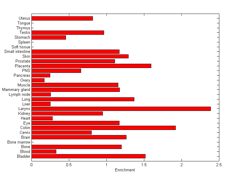 The expression level is normalized with tissue-library size. Each value for a gene in a tissue is a ratio of observed ESTs to the expected one in this tissue. The expected number of ESTs is the product of total ESTs of the gene and the fraction of total ESTs in the tissue among all ESTs in 30 tissues.