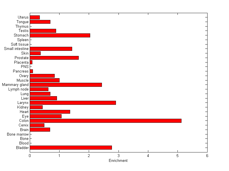 The expression level is normalized with tissue-library size. Each value for a gene in a tissue is a ratio of observed ESTs to the expected one in this tissue. The expected number of ESTs is the product of total ESTs of the gene and the fraction of total ESTs in the tissue among all ESTs in 30 tissues.