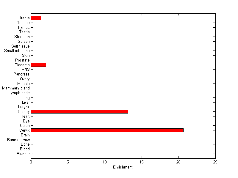 About the profile: The expression level is normalized with tissue-library size. Each value for a gene in a tissue is a ratio of observed ESTs to the expected one in this tissue. The expected number of ESTs is the product of total ESTs of the gene and the fraction of total ESTs in the tissue among all ESTs in 30 tissues. Summary: This gene is preferentially expressed in [cervix, kidney] Download: |