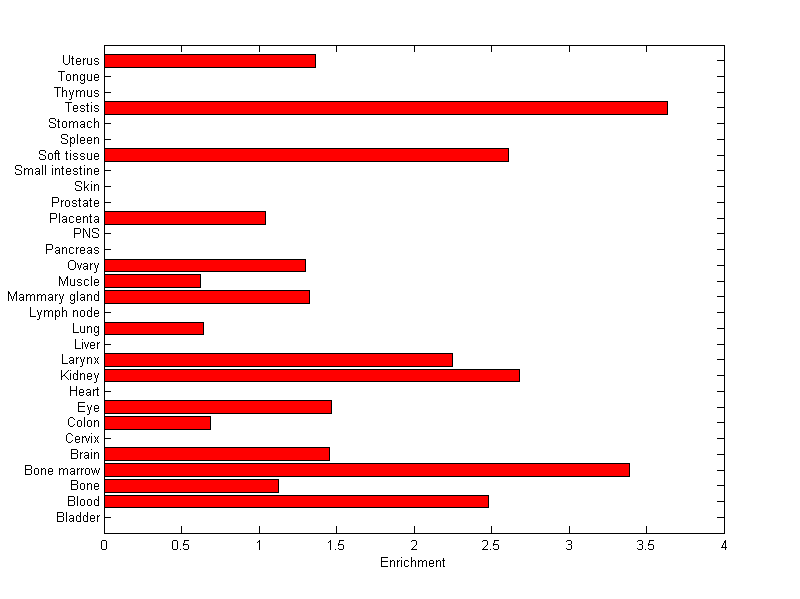 The expression level is normalized with tissue-library size. Each value for a gene in a tissue is a ratio of observed ESTs to the expected one in this tissue. The expected number of ESTs is the product of total ESTs of the gene and the fraction of total ESTs in the tissue among all ESTs in 30 tissues.