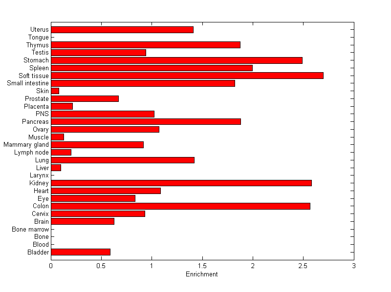 The expression level is normalized with tissue-library size. Each value for a gene in a tissue is a ratio of observed ESTs to the expected one in this tissue. The expected number of ESTs is the product of total ESTs of the gene and the fraction of total ESTs in the tissue among all ESTs in 30 tissues.