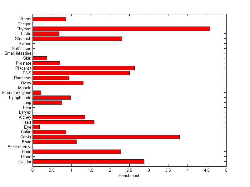 The expression level is normalized with tissue-library size. Each value for a gene in a tissue is a ratio of observed ESTs to the expected one in this tissue. The expected number of ESTs is the product of total ESTs of the gene and the fraction of total ESTs in the tissue among all ESTs in 30 tissues.