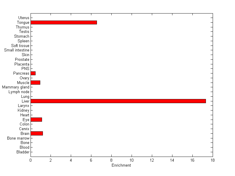 About the profile: The expression level is normalized with tissue-library size. Each value for a gene in a tissue is a ratio of observed ESTs to the expected one in this tissue. The expected number of ESTs is the product of total ESTs of the gene and the fraction of total ESTs in the tissue among all ESTs in 30 tissues. Summary: This gene is preferentially expressed in [liver] Download: |