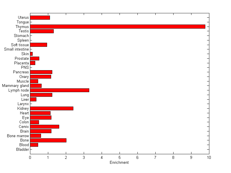 The expression level is normalized with tissue-library size. Each value for a gene in a tissue is a ratio of observed ESTs to the expected one in this tissue. The expected number of ESTs is the product of total ESTs of the gene and the fraction of total ESTs in the tissue among all ESTs in 30 tissues.