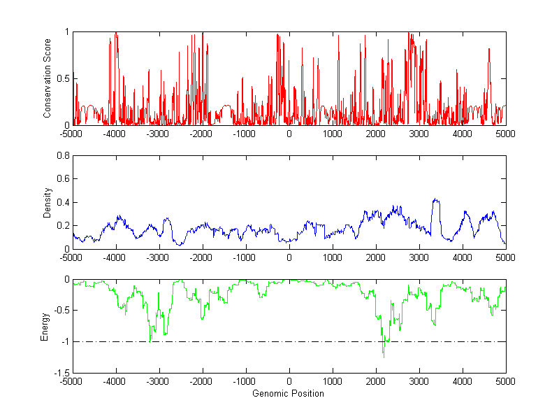 About the profiles: The conservation profile (red curve) is about conservation scores of the promoter sequences. Conservation was determined from an eight-way alignment of human, chimpanzee, dog, mouse, rat, chicken, zebrafish and fugu sequences. The conservation was quantified by a conservation score between 0 and 1, with 1 as highest conservation. The conservation score was obtained from UCSC genome databases. The density profile (blue curve) is about density of all TF binding sites. The energy profile (green curve) is about energy for module detection based on TF interaction. The positions with energy less than -1 indicate the existence of CRMs. Download: Conservation profileDensity profile Energy profile CRM summary |