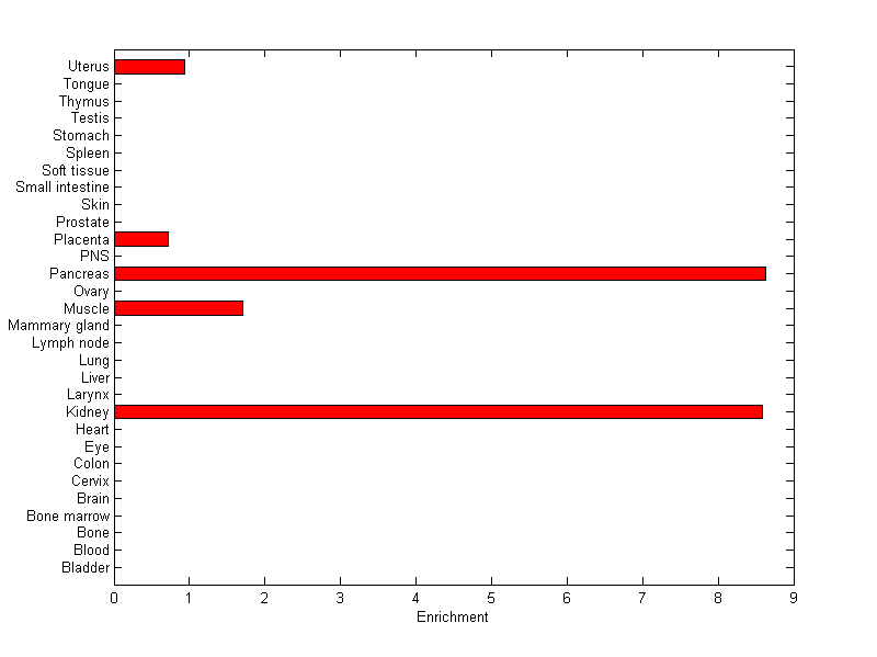 About the profile: The expression level is normalized with tissue-library size. Each value for a gene in a tissue is a ratio of observed ESTs to the expected one in this tissue. The expected number of ESTs is the product of total ESTs of the gene and the fraction of total ESTs in the tissue among all ESTs in 30 tissues. Summary: This gene is preferentially expressed in [kidney, pancreas] Download: |
