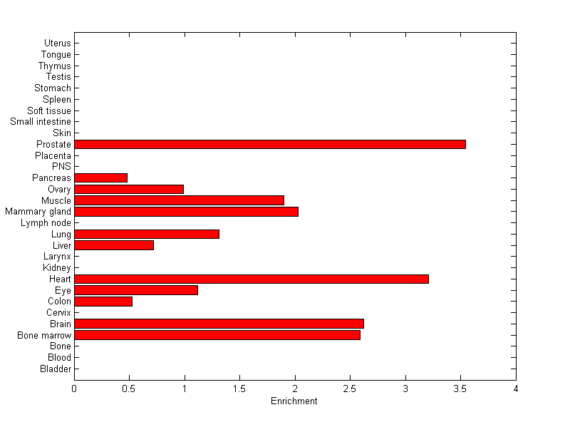 The expression level is normalized with tissue-library size. Each value for a gene in a tissue is a ratio of observed ESTs to the expected one in this tissue. The expected number of ESTs is the product of total ESTs of the gene and the fraction of total ESTs in the tissue among all ESTs in 30 tissues.