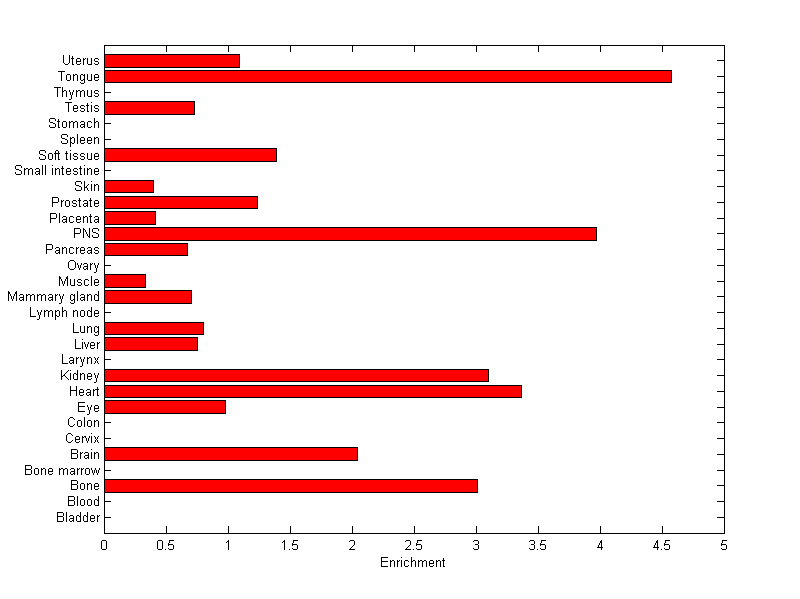 The expression level is normalized with tissue-library size. Each value for a gene in a tissue is a ratio of observed ESTs to the expected one in this tissue. The expected number of ESTs is the product of total ESTs of the gene and the fraction of total ESTs in the tissue among all ESTs in 30 tissues.