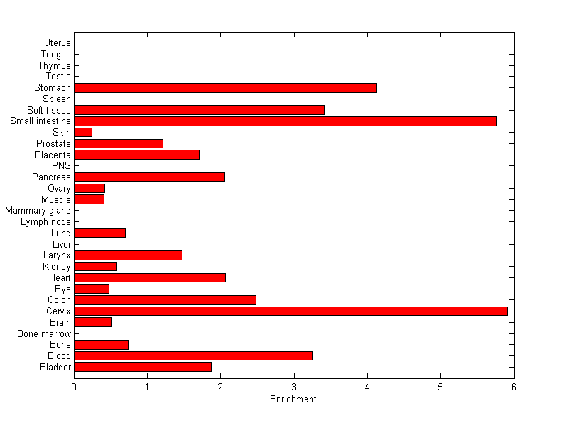 The expression level is normalized with tissue-library size. Each value for a gene in a tissue is a ratio of observed ESTs to the expected one in this tissue. The expected number of ESTs is the product of total ESTs of the gene and the fraction of total ESTs in the tissue among all ESTs in 30 tissues.