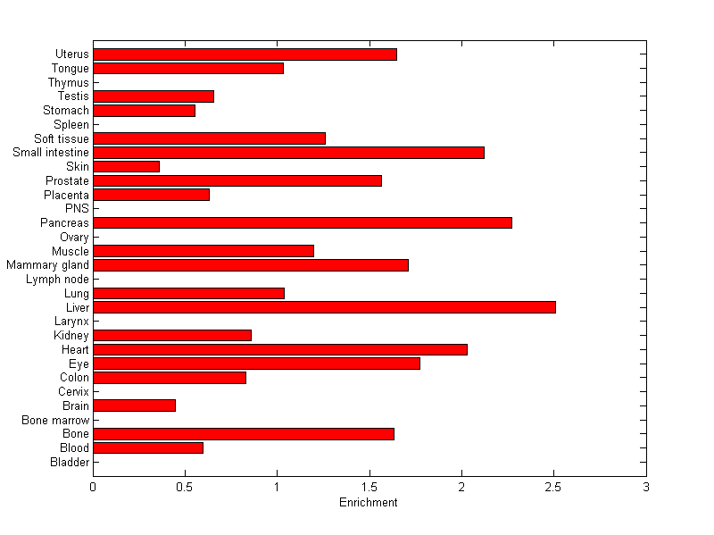 The expression level is normalized with tissue-library size. Each value for a gene in a tissue is a ratio of observed ESTs to the expected one in this tissue. The expected number of ESTs is the product of total ESTs of the gene and the fraction of total ESTs in the tissue among all ESTs in 30 tissues.