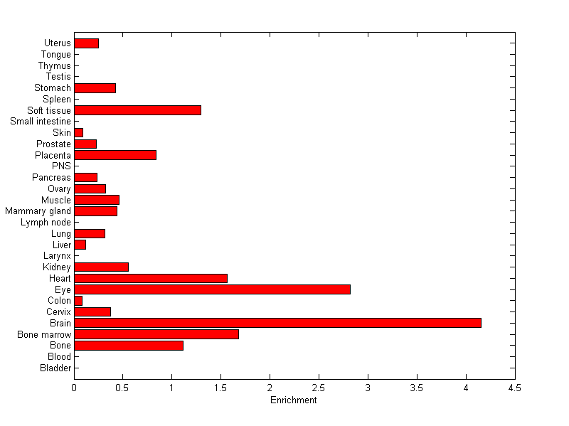 The expression level is normalized with tissue-library size. Each value for a gene in a tissue is a ratio of observed ESTs to the expected one in this tissue. The expected number of ESTs is the product of total ESTs of the gene and the fraction of total ESTs in the tissue among all ESTs in 30 tissues.