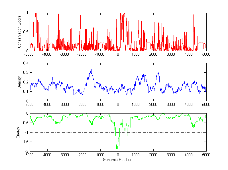 The energy profile (green curve) is about energy for module detection based on TF interaction. The positions with energy less than -1 indicate the existence of CRMs.