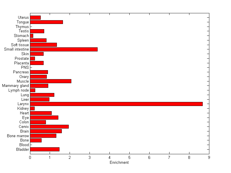 The expression level is normalized with tissue-library size. Each value for a gene in a tissue is a ratio of observed ESTs to the expected one in this tissue. The expected number of ESTs is the product of total ESTs of the gene and the fraction of total ESTs in the tissue among all ESTs in 30 tissues.