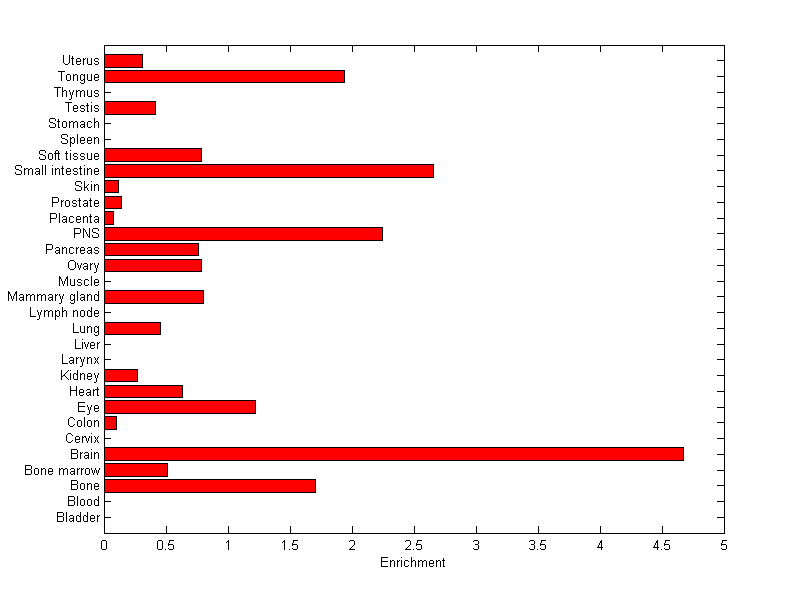 The expression level is normalized with tissue-library size. Each value for a gene in a tissue is a ratio of observed ESTs to the expected one in this tissue. The expected number of ESTs is the product of total ESTs of the gene and the fraction of total ESTs in the tissue among all ESTs in 30 tissues.