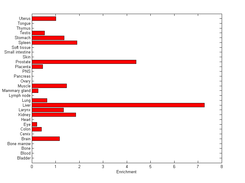 The expression level is normalized with tissue-library size. Each value for a gene in a tissue is a ratio of observed ESTs to the expected one in this tissue. The expected number of ESTs is the product of total ESTs of the gene and the fraction of total ESTs in the tissue among all ESTs in 30 tissues.