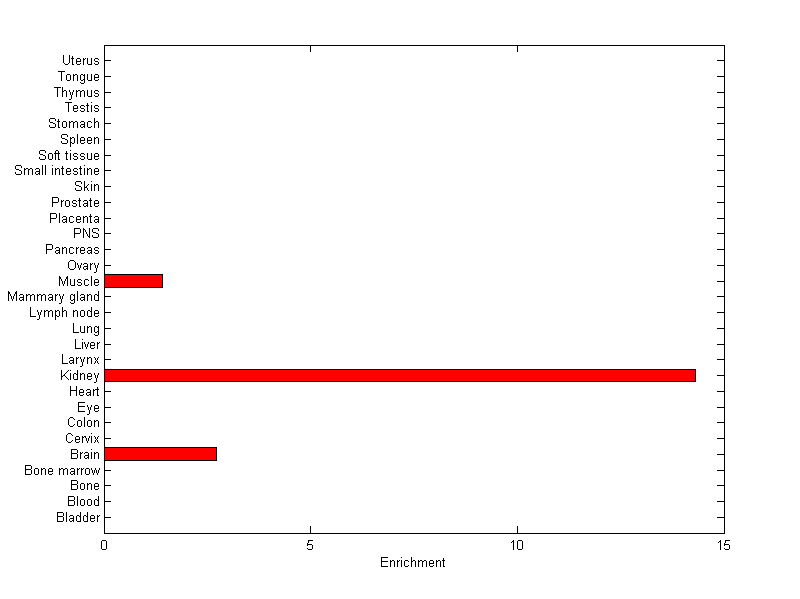 The expression level is normalized with tissue-library size. Each value for a gene in a tissue is a ratio of observed ESTs to the expected one in this tissue. The expected number of ESTs is the product of total ESTs of the gene and the fraction of total ESTs in the tissue among all ESTs in 30 tissues.