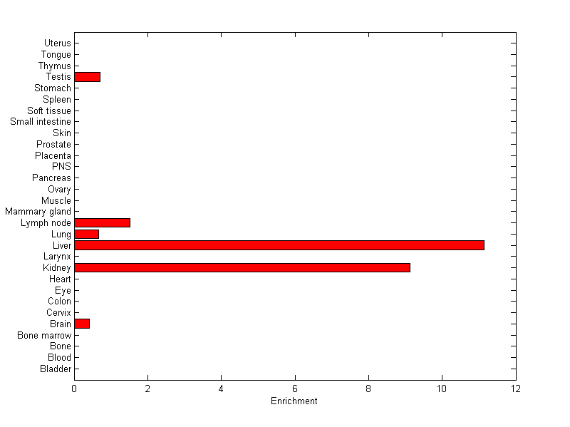 About the profile: The expression level is normalized with tissue-library size. Each value for a gene in a tissue is a ratio of observed ESTs to the expected one in this tissue. The expected number of ESTs is the product of total ESTs of the gene and the fraction of total ESTs in the tissue among all ESTs in 30 tissues. Summary: This gene is preferentially expressed in [kidney, liver] Download: |