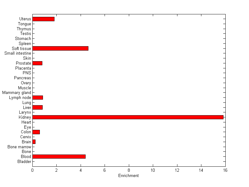 About the profile: The expression level is normalized with tissue-library size. Each value for a gene in a tissue is a ratio of observed ESTs to the expected one in this tissue. The expected number of ESTs is the product of total ESTs of the gene and the fraction of total ESTs in the tissue among all ESTs in 30 tissues. Summary: This gene is preferentially expressed in [kidney] Download: |